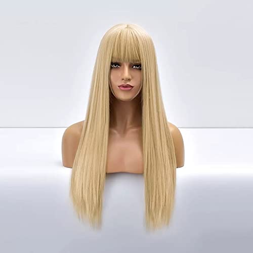 Generic - باروكة شعر مفرود وأسود وطويل مع غرة شعر صناعي قابلة للغسل وتتحمل الحرارة.