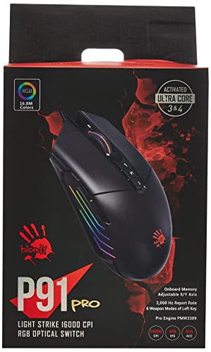 Bloody - ماوس العاب P91 برو نشط بإضاءة RGB - 16.000 خطوة في البوصة - بيسكارت PMW3389- 6 اوضاع للاسلحة - استجابة مفاتيح 1 مللي في الثانية - 12000 اطار في الثانية من بلودي