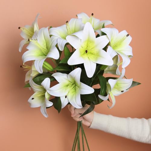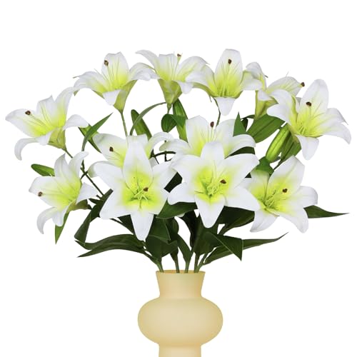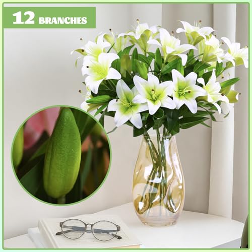 Bloom Life - زهور زنبق صناعية من بلوم لايف، 6 سيقان مع اجمالي 12 زهرة و6 براعم، زهور صناعية واقعية لديكور المنزل، ابيض او بينك، بطول 23.6 انش، سيقان خالية من التجاعيد وقابلة للانحناء لترتيبات المزهريات (ابيض)