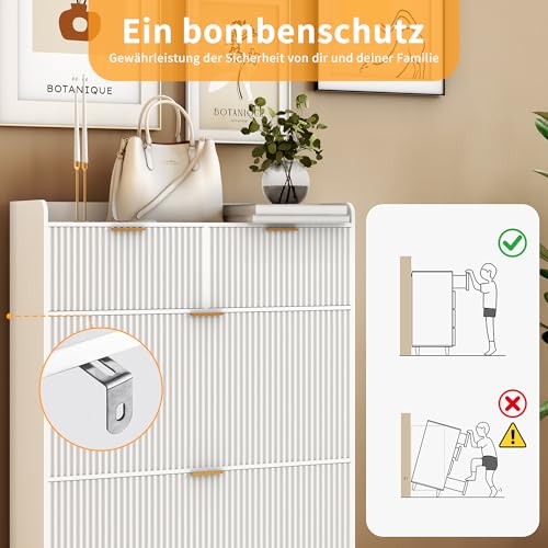 - عناصر أمان مقاومة للانقلاب: خزانة المدخل. لضمان سلامة عائلتك، وخاصة الأطفال، تم تجهيز خزانة الأحذية هذه بعناصر مقاومة للانقلاب. يمكنك تثبيتها على الحائط لمنعه من الانقلاب بسبب القوى الخارجية، وبالتالي توفير أمان إضافي.