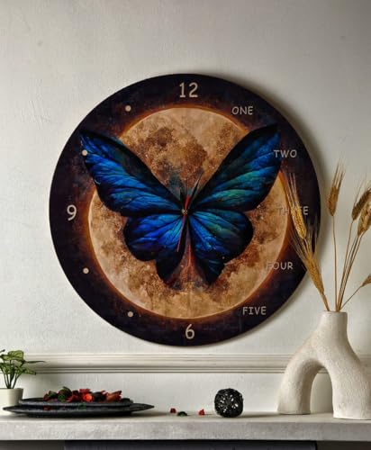Generic - ساعة حائط زرقاء على شكل فراشة وقمر، ساعة ديكور دائرية، تصميم فني (40 سم)