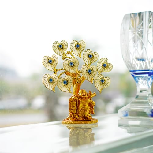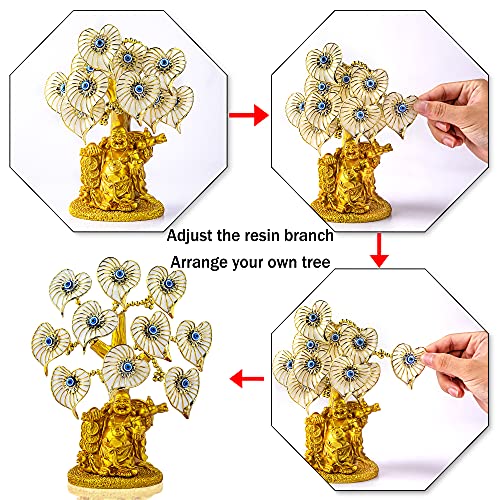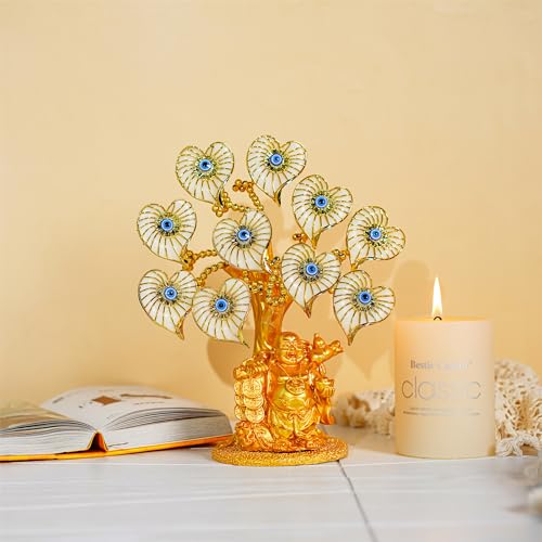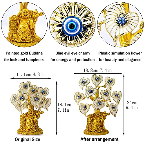 YU FENG - شجرة نقود بتصميم عين الحسد الزرقاء مع تمثال بوذا ذهبي مطلي بالزهور الاصطناعية البيضاء للمنزل والمكتب، زينة فينغ شوي