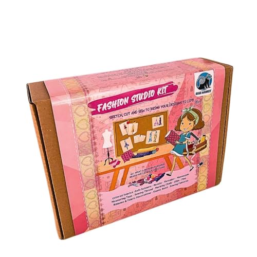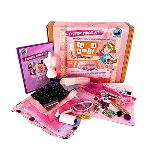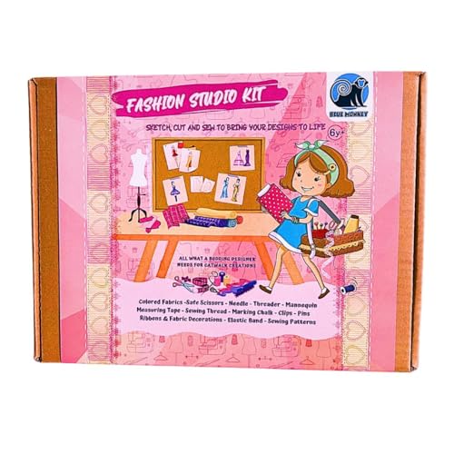 Blue Monkey - طقم الخياطة وتصميم الأزياء من بلو مونكي للبنات، مصنوع من القماش بألوان متعددة، مناسب لعمر 6 سنوات. طقم شامل للمبتدئين مع عرض منصة صغير