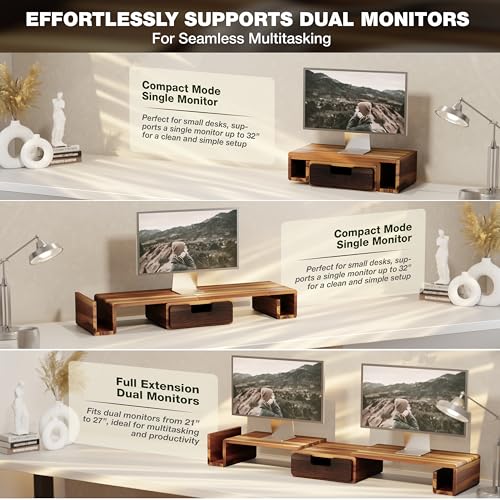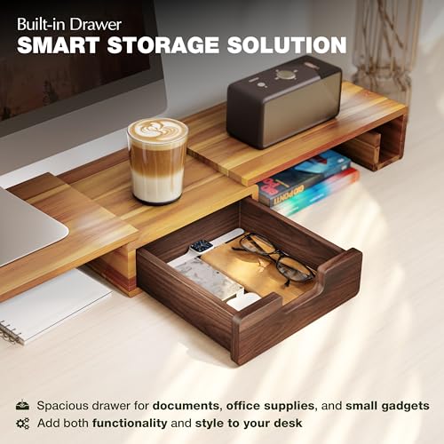 - ✔ درج خشبي مدمج لتخزين إضافي – يحتوي على درج خشبي ينزلق بسلاسة، مثالي لتخزين مستلزمات المكتب مثل الأقلام، الدفاتر الصغيرة، ومشغلات USB، وغيرها من الضروريات الصغيرة. يحافظ حامل الشاشة هذا المزود بدرج على مساحة عملك أنيقة وخالية من الفوضى.