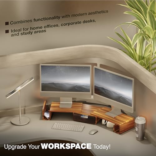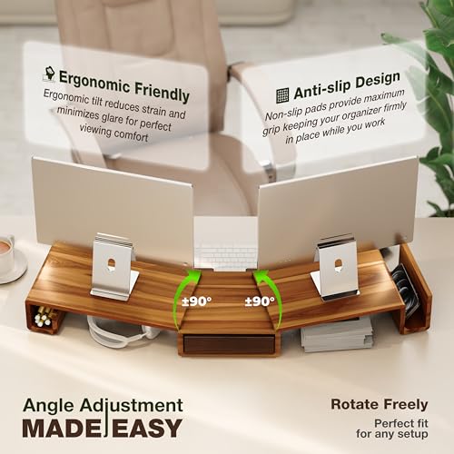 BLUEWEST - حامل شاشة مزدوج خشبي من اكاسيا مع درج، حامل شاشة مريح للمكتب بطول قابل للتعديل وزاوية دوارة، منظم سطح المكتب الخشبي للكمبيوتر المحمول والكمبيوتر والطابعة من بلو ويست، 1 م