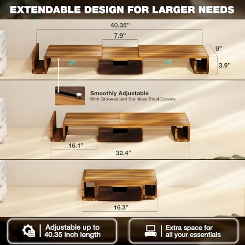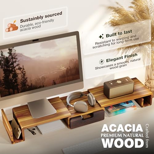 - ✔ خشب الاكاسيا الطبيعي الفاخر – مصنوع من خشب الاكاسيا الطبيعي 100%، هذا الحامل للشاشة مع درج صديق للبيئة، متين ومقاوم للانحناء أو التشقق، مما يضمن ترقية لمساحة عملك تدوم طويلاً وتتمتع بمظهر أنيق.