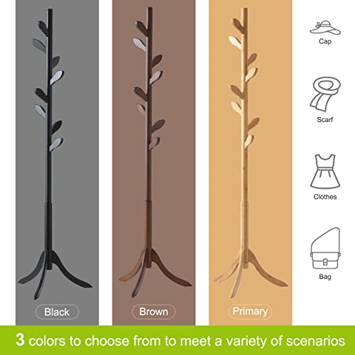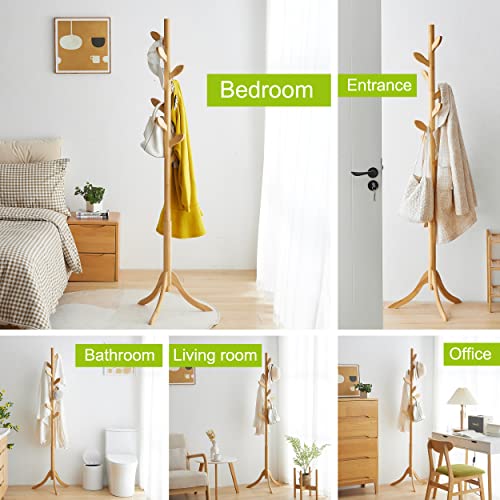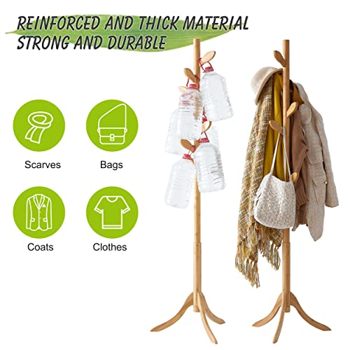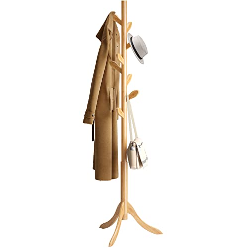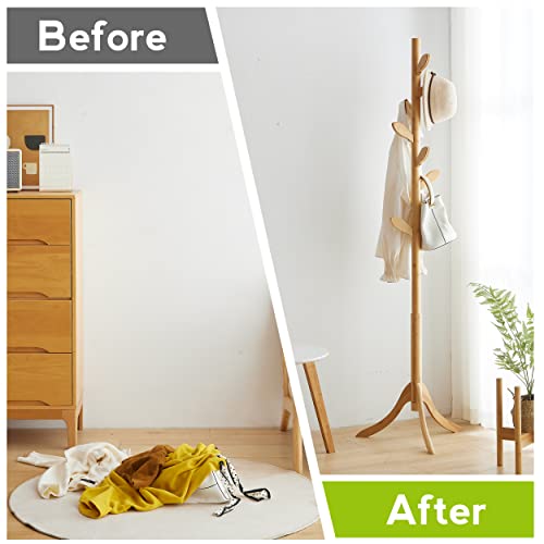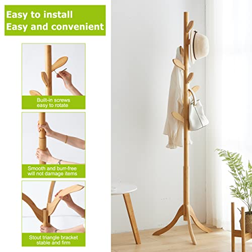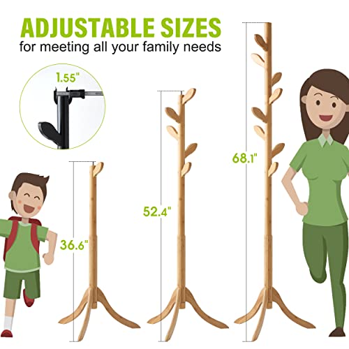 BMOSU - رف معاطف قائم بذاته من الخيزران حامل قابل للتعديل مع 3 اقسام و8 خطافات شماعات معطف سهلة التجميع للقبعات والخزانة وغرفة النوم والمكتب والمدخل وخطاف اوراق الشجر طبيعي خشب بي موسو