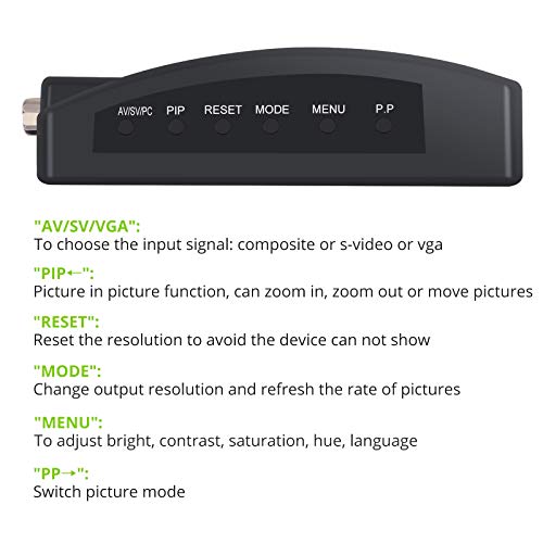 - 【في جي ايه/ اس فيديو/ بي ان سي إلى في جي ايه】 تحويل إشارة في جي ايه، 4 دبابيس فيديو S-video أو بي ان سي إلى إشارة عرض في جي ايه. مع موصل BNC إلى AV أنثى، يمكن للمستخدمين تحويل إشارة AV إلى إشارة عرض VGA.