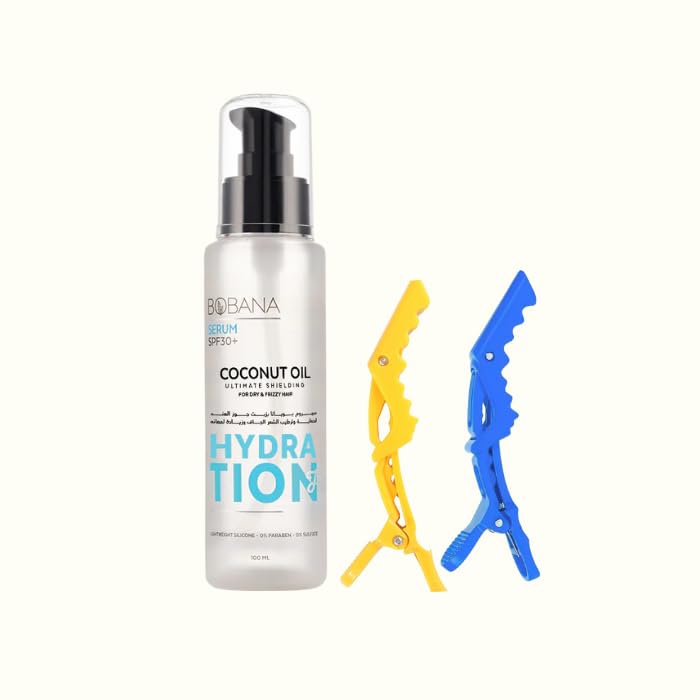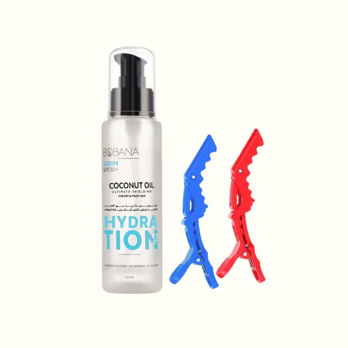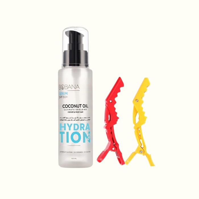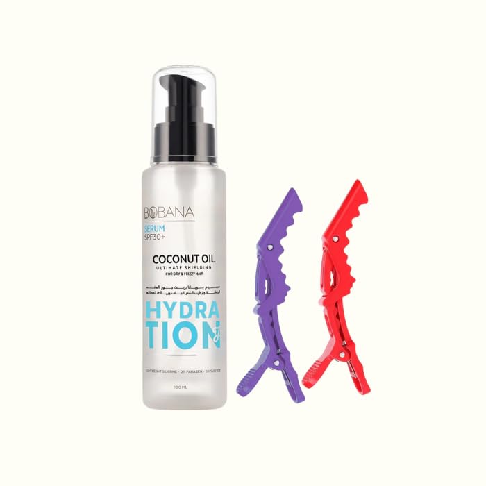 Bobana - بوبانا سيروم زيت جوز الهند للشعر الجاف، ١٠٠ مل، مع مشبكين للشعر متعددي الألوان، حماية SPF30