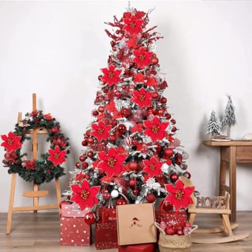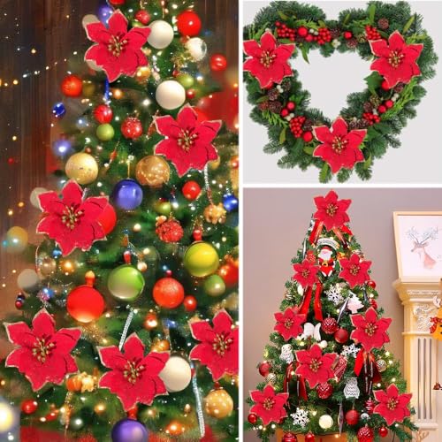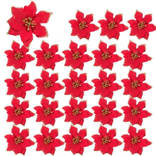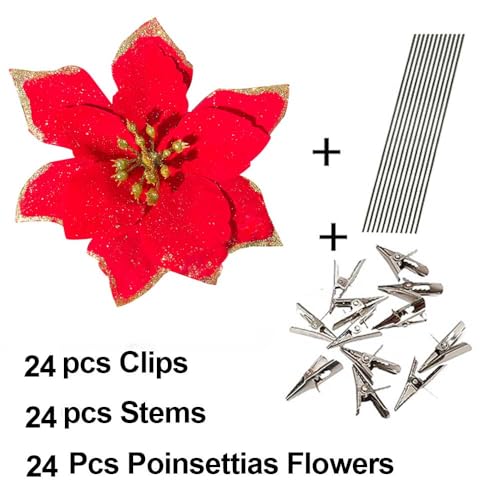 Bodosac - زهور البوينسيتيا الاصطناعية اللامعة للكريسماس مع مشبك لتزيين شجرة الكريسماس من بودوساك، مقاس 12.7 سم، 24 قطعة (أحمر)