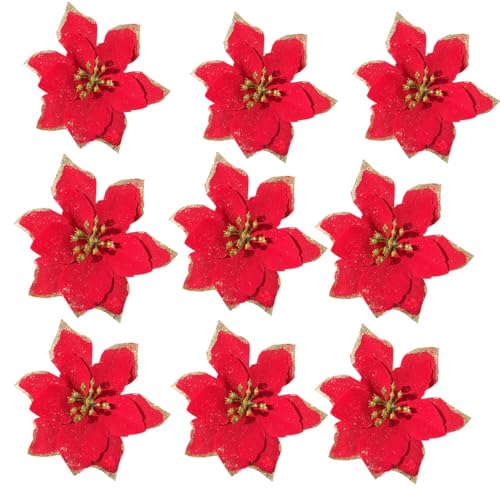 - قائمة محتويات العبوة: 24 قطعة من زهور الكريسماس اللامعة، 24 قطعة مشبك. مقاس الزهرة 12.7 سم.