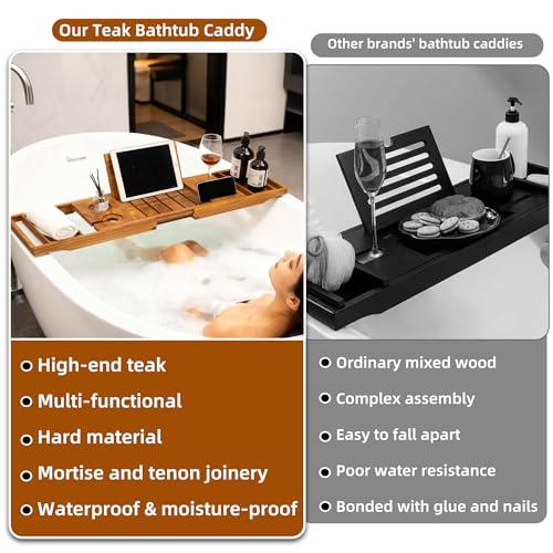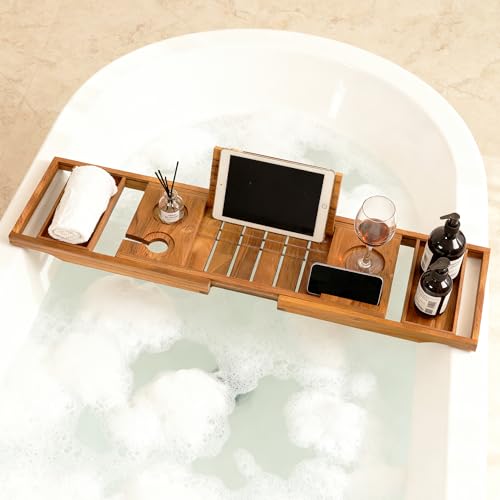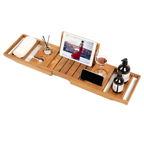 Boflay - صينية حوض استحمام قابلة للتوسيع من خشب الساج، حامل حمام خشب ورف حوض استحمام، طاولة حمام فوق الحوض مع حامل للكتب وكأس النبيذ، منظم حمام مقاوم للماء لتجربة سبا من بوفلاي