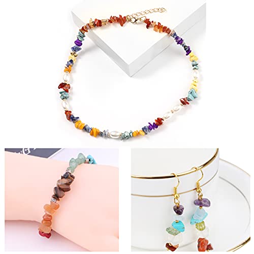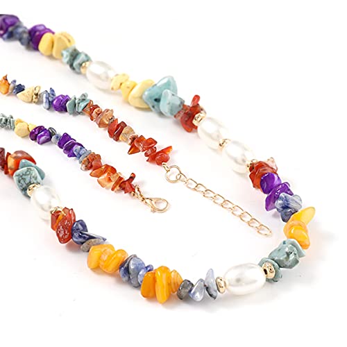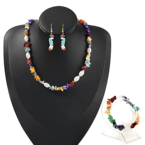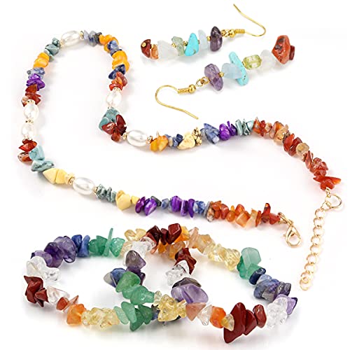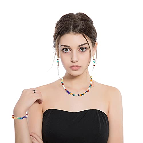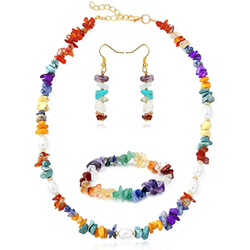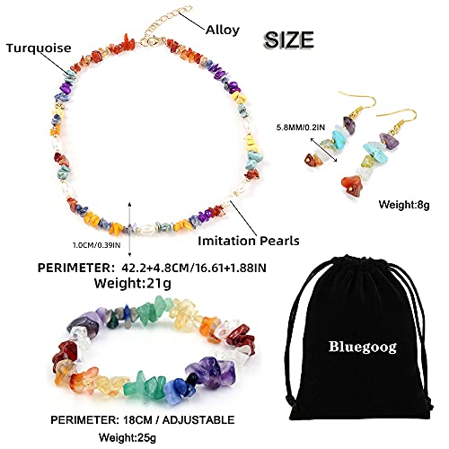 Bluegoog - طقم مجوهرات من الأحجار الكريمة الطبيعية بنمط بوهيمي للنساء، عقد ضيق من اللؤلؤ الفيروزي وسوار كريستال وحلقان متدلية ملونة، كيس هدية