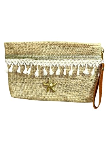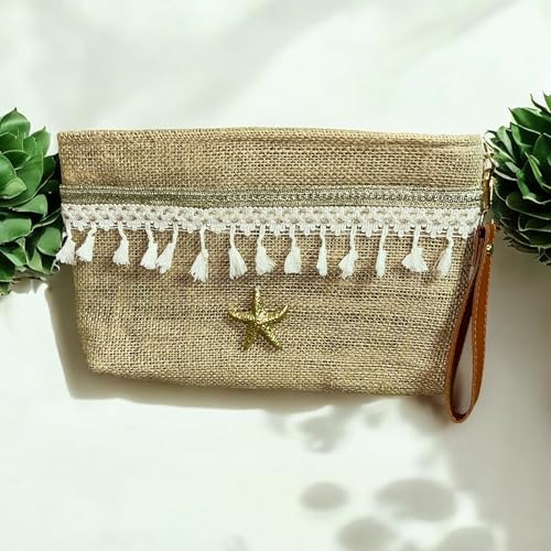 Generic - حقيبة يد بوهو بيتش من الخيش الطبيعي مع شراشيب بيضاء ونجم البحر الذهبي، حزام جلدي