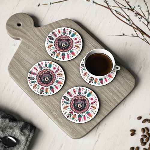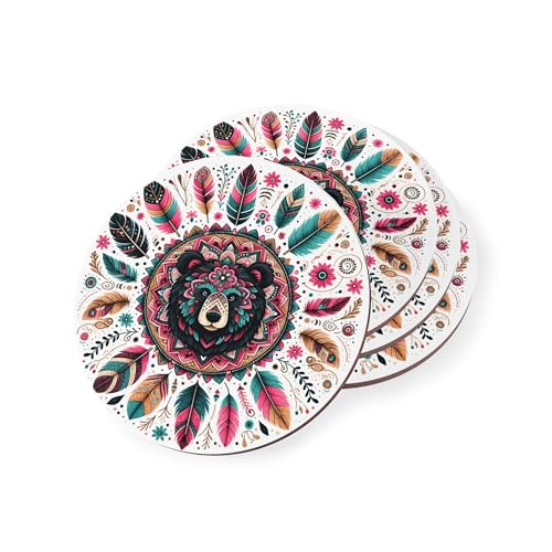 Generic - مجموعة قواعد أكواب خشبية مزينة بنقشة بوهو بير وترايبال ماندالا والريش والزهور مقاومة للحرارة طقم 1 من 4 قطع