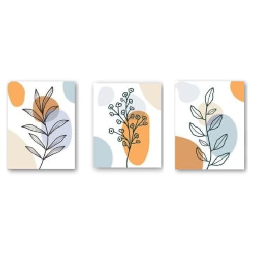 - التصميم: مجموعة من 3 مطبوعات نباتية حديثة تتميز بخط فني بسيط مع أوراق أنيقة بدرجات اللون الخوخي الناعم والأزرق.