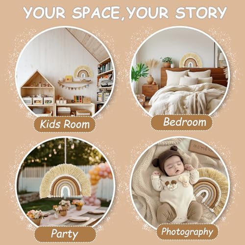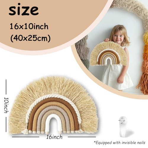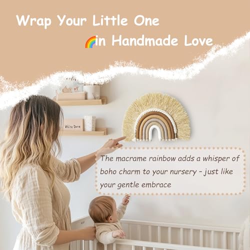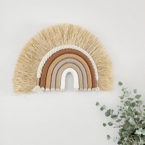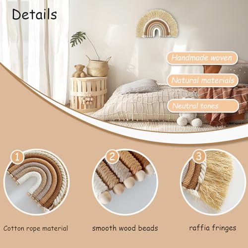 YarnieJiajia - ديكور حائط لغرف الأطفال بنمط بوهو بتصميم قوس قزح، مُعلقة جدارية، ديكور فني من المكرمية المنسوجة يدويا مع خرز خشبي وقش، زينة بألوان محايدة لغرف البنات والأطفال والمواليد، واستقبال المولود