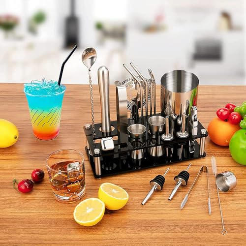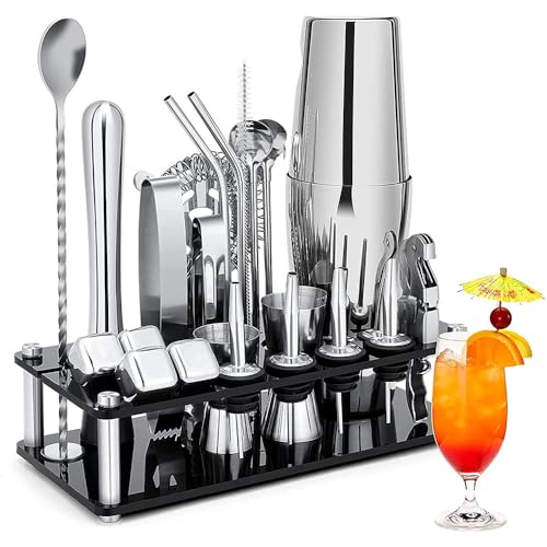 - 🎁【مجموعة شيكر كوكتيل من 23 قطعة】مجموعة نادل بوسطن، مجموعة واحدة لتلبية جميع احتياجاتك. تتكون من مجموعة من علب شيكر بوسطن سعة 750 + 550 مل، 4 صب، كوب قياس مزدوج 15/30 مل و25/50 مل، ملقط ثلج، 2 ملعقة ماصة، 2 ماصة منحنية، فتاحة فرشاة، ملعقة خلط، 4 أحجار من الستانلس ستيل، وصفة كوكتيل، مشبك أحجار، مصفاة، حامل اكريليك، كوكتيل كوكتيل كتيب اي بي اس