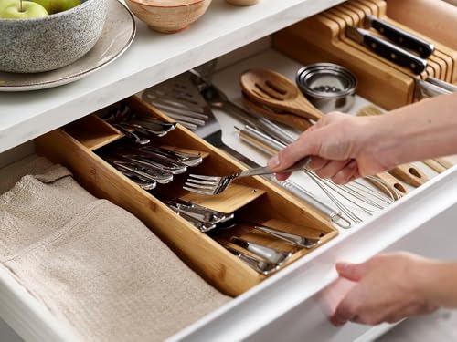 - 🔵【تصميم من خشب البامبو الفاخر】 - مصنوع من خشب البامبو الطبيعي 100%، يتميز منظم درج أدوات المائدة هذا بمتانة عالية وفوائد صديقة للبيئة مقارنة بالبدائل البلاستيكية مع مفاصل معززة لأداء طويل الأمد في مطبخك.