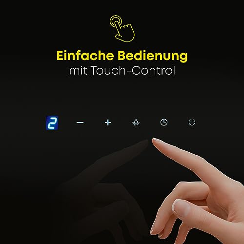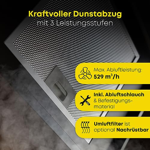 - الوظائف: يتم التحكم في تشغيل الجهاز والإضاءة من خلال التحكم باللمس في الجزء الأمامي من الجهاز. تُعلمك شاشة ال اي دي عالية الجودة في أي وقت بحالة تشغيل شفاط الطهي (على سبيل المثال: مستوى الطاقة الحالية).
