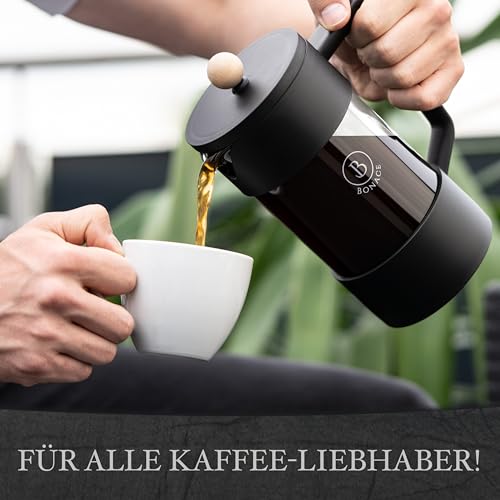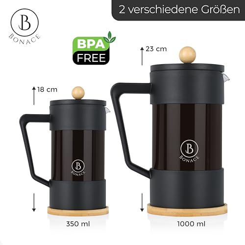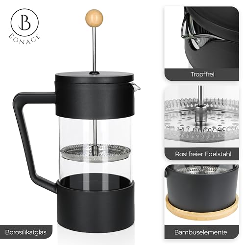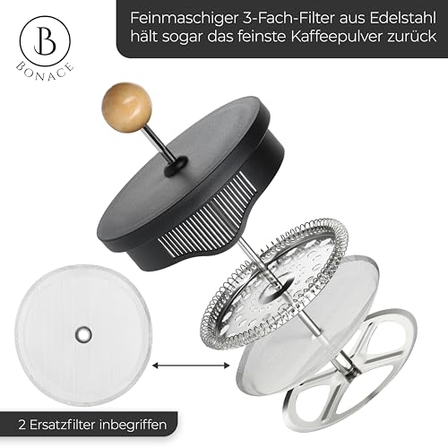 BONACE - ماكينة تحضير القهوة الفرنسية من زجاج البوروسيليكات الأسود مع عناصر الخيزران ملعقة مشبك الستانلس ستيل وفرشاة تنظيف وفلترين بديلين لـ 6 أكواب سعة 1 لتر بونيس