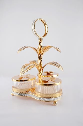 - تصميم فاخر: طقم تقديم بحامل ذهبي على شكل شجرة مرصع بالفصوص، يضيف لمسة من الفخامة والأناقة لمنزلك أو مناسباتك الخاصة