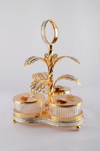 - أوعية متعددة: يأتي مع أوعية زجاجية بلمسات كريستالية متعددة الاستخدامات لتقديم المكسرات، التمور، الحلويات والشوكولاتة بأسلوب راقي