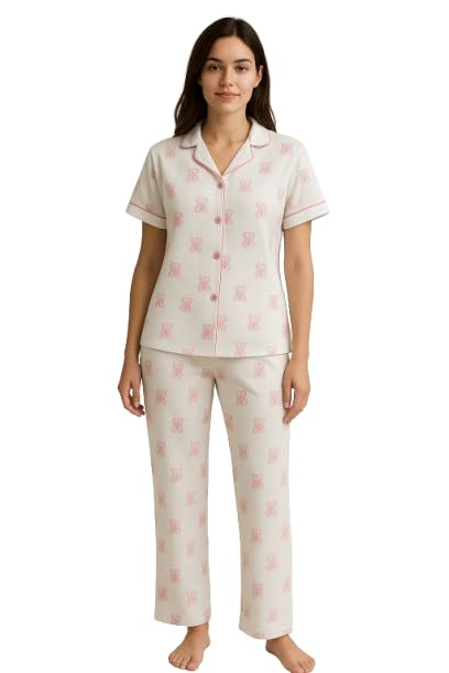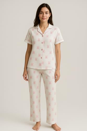 BONO بونو - طقم بيجامة للنساء من بونو، بلوزة باكمام قصيرة وبنطلون طويل، ابيض مع نمط بينك - 25191