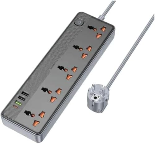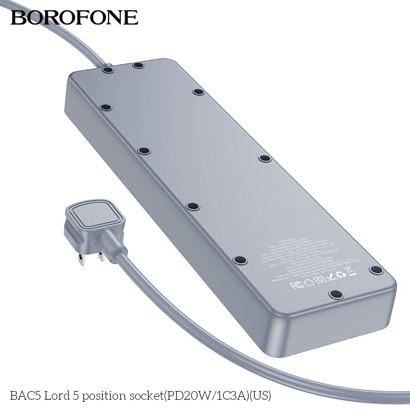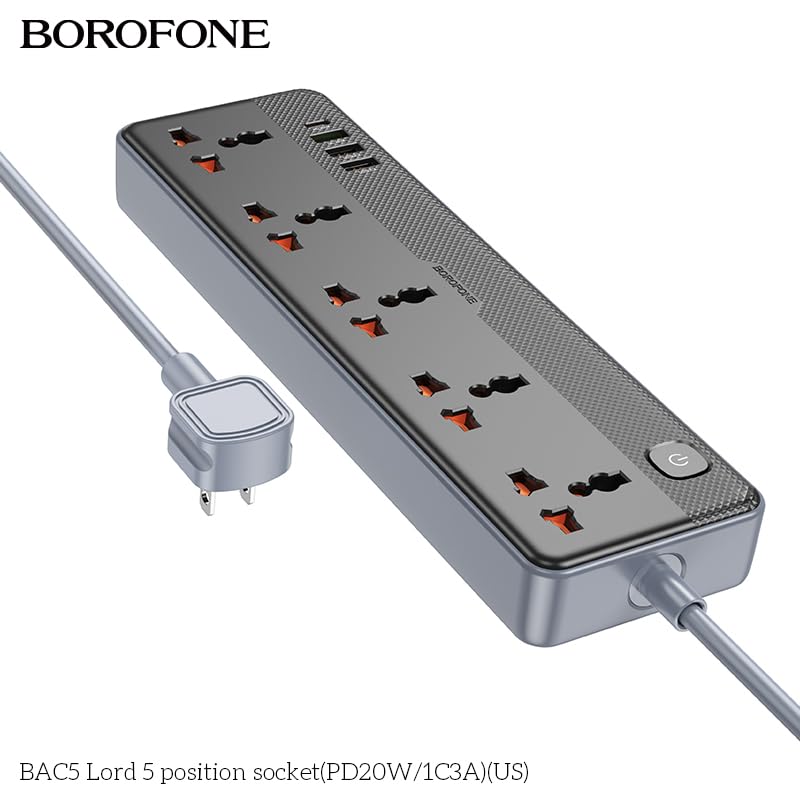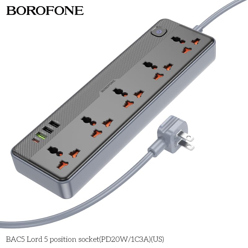 BOROFONE. - مشترك كهرباء لورد مع 5 منافذ و3 منافذ USB ومنفذ واحد من النوع سي بقوة شحن 20 وات من بوروفون - أسود 1C3A