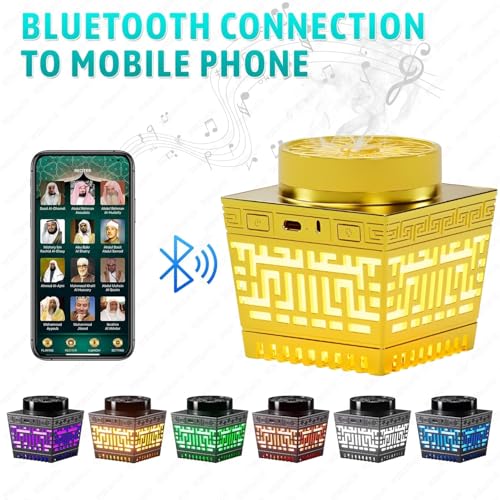BORTONY - مكبر صوت للقرآن الكريم يعمل بالبلوتوث MP3 به 18 مقرئ و17 ترجمة مع مبخرة بخور صغيرة يتم التحكم بها عن بعد متعددة الألوان من بورتوني، لون ذهبي