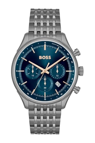 Hugo Boss - ساعة جريجور كيو تي زد فاشن كرونو بمينا دائري ازرق للرجال | مادة ستيل رمادية مطلية ايونيا | سوار رمادي اللون من بوس - 1514083