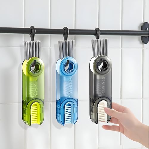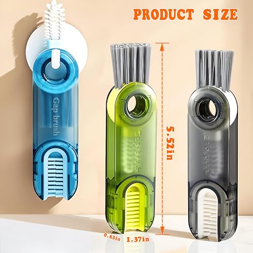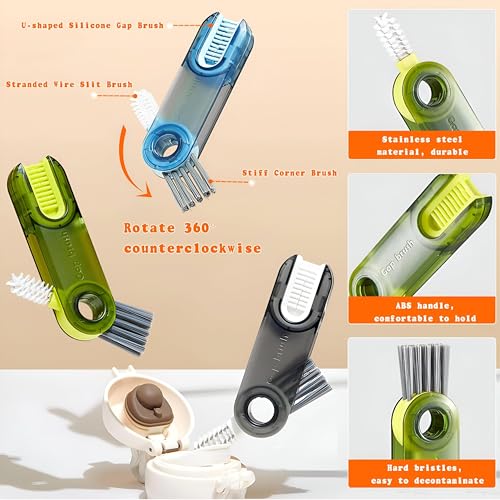 - تحتوي هذه الفرشاة 3 في 1 على ثلاثة رؤوس مختلفة: فرشاة سيليكون على شكل حرف U لتنظيف فم الكوب والبقع العنيدة، فرشاة شق سلكية مجدولة لتنظيف الأخاديد الدقيقة والفراغات بداخل الأغطية، وأخرى لزاوية الحاوية الصعبة لإزالة الأوساخ العميقة، مع قدرة على الدوران 360 درجة في اتجاه واحد لتسهيل الوصول والتنظيف بكفاءة عالية.