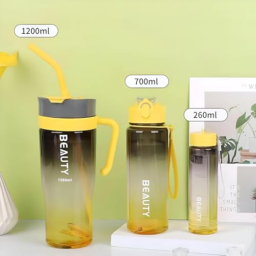 - تتوفر مجموعة شاملة من ثلاثة أحجام مختلفة للزجاجات - 1200 مل و700 مل و260 مل، مما يسمح للمستخدم بالاختيار حسب الحاجة سواء أثناء التمرين أو المشي لمسافات طويلة أو في العمل لزيادة مستوى الترطيب بشكل دائم ومريح.