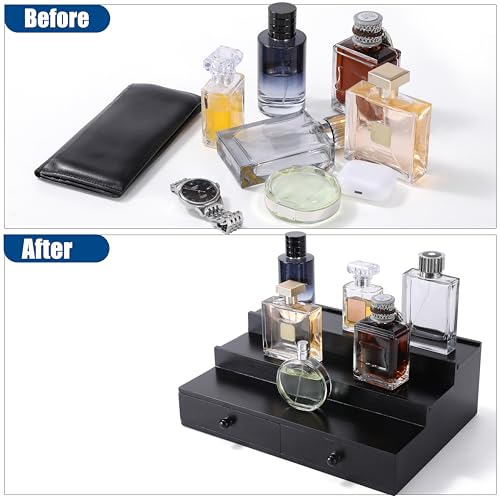 - 【سعة كبيرة】- يمكن لمنظم الكولونيا المكون من 3 طبقات حمل ما لا يقل عن 12 زجاجة من العطور، ويحتوي على درجين في الأسفل لتخزين الساعات والخواتم والحمل اليومي. إضافة مثالية لسطح طاولة المكياج وتخزين الملحقات.