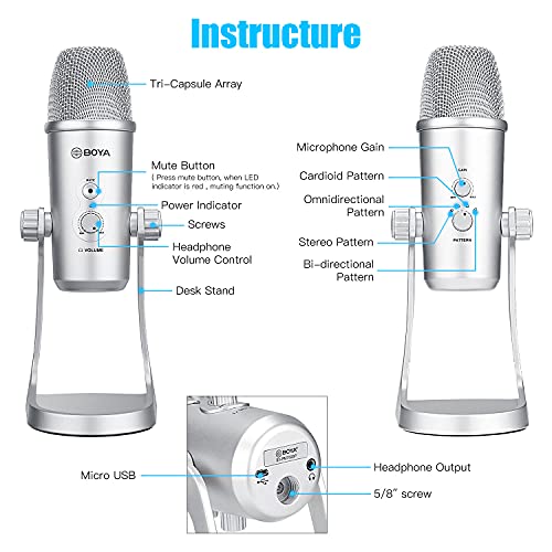 BOYA - ميكروفون مكثف بويا BY-PM700SP بمنفذ USB من مايك للتسجيل والبث والمدونات الصوتية لاجهزة iOS واندرويد والكمبيوتر بنظام ويندوز وماك أبيض