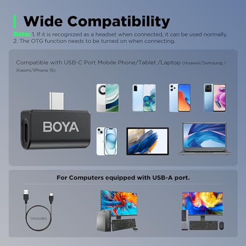 BOYA - ميكروفون لاسلكي USB C اوميك لاندرويد من بويا، بطارية 18 ساعة، مشبك مزدوج على طية صدر السترة، ميكروفون USB نوع C لهواتف اندرويد/C، لتسجيل البودكاست والفيديوهات، بث مباشر، مدونات مرئية ومقابلات