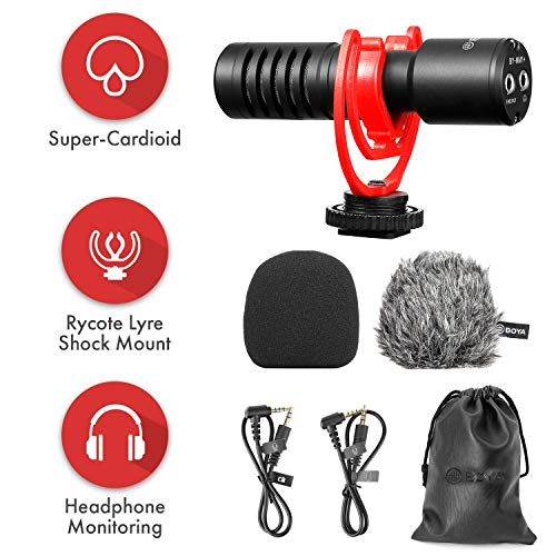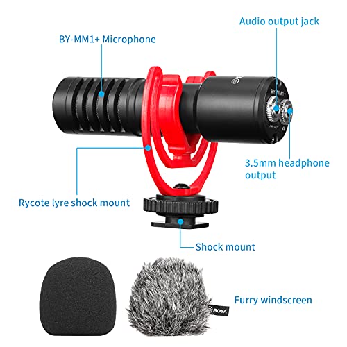 BOYA - ميكروفون من بويا طراز باي-MM1+ باللون الأسود مع توصيل أوكسيلياري، يتميز بخاصية إلغاء الضوضاء ومراقبة السماعات والتوصيل المباشر، متوافق مع الكاميرات
