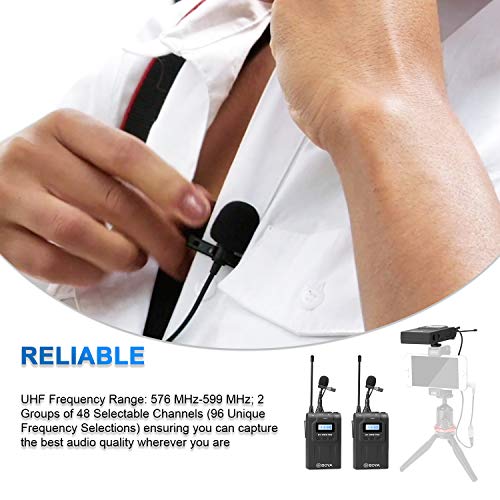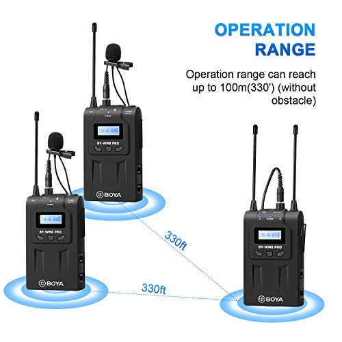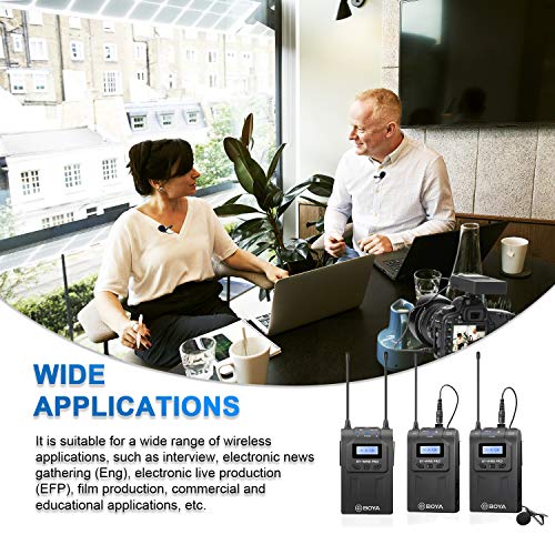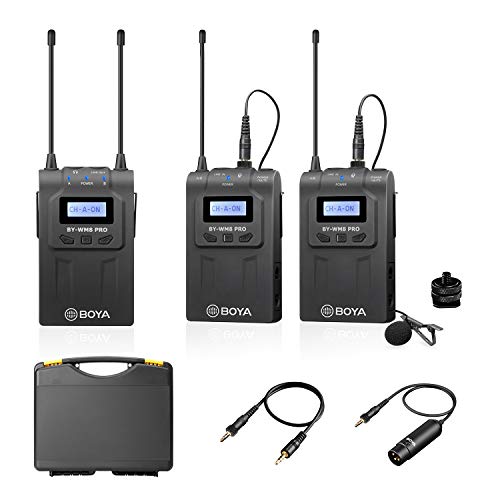BOYA - نظام ميكروفون ولاسلكي UHF من بويا مع اجهزة ارسال لاسلكية واستقبال - متوافق كاميرا كانون نيكون دي اس ال ار وكاميرا XLR وايفون - مثالي للمقابلات وتسجيل الفيديو والفلوجنج أحادى