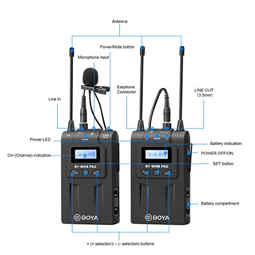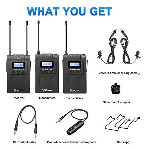 - يتكون نظام by-wm8 pro-k2 من جهازي إرسال للجسم، وجهاز استقبال يثبت بالكاميرا، وميكروفونين لافالير متعدد الاتجاهات. يتضمن هذا النظام أيضًا محول تثبيت أحذية، وكابل إخراج واحد 1/8 انش إلى اكس ال ار، وكابل إخراج واحد 1/8 إلى 1/8 انش، وحقيبة حمل