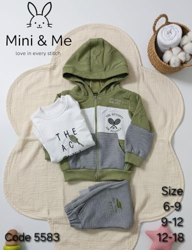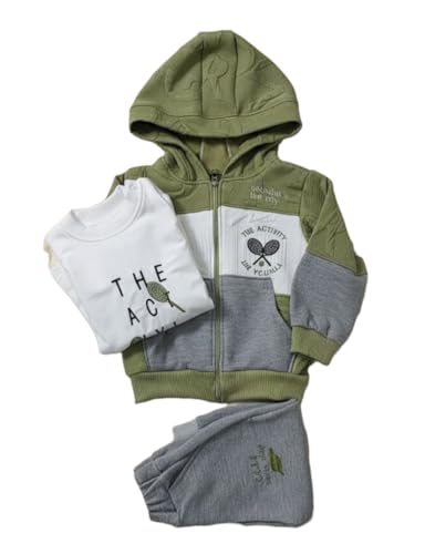 Generic - طقم بدلة رياضية من 3 قطع مكون من سويت شيرت بغطاء للرأس وسوستة مع تيشرت وبنطلون رياضي، للأولاد من عمر 9 أشهر، لون أخضر زيتوني ورمادي