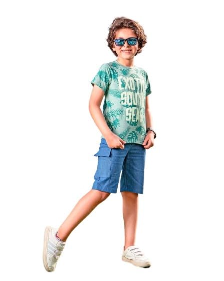طقم اولادي مكون من قطعتيين تيشرت نص كوم اخضر وشورت ازرق