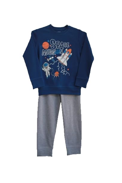 BONO بونو - طقم سويت شيرت وبنطلون رياضي بتصميم سبيس ميشن موديل 25042 للأولاد، لون أزرق كحلي ورمادي -2 قطعة