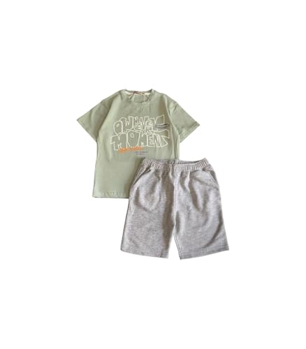 Generic - طقم ملابس صيفية للاولاد، تي شيرت جرافيك اخضر داكن مع شورت قطني رمادي، كاجوال من قطعتين