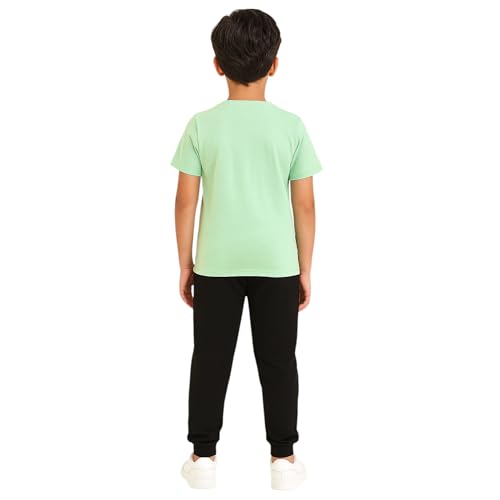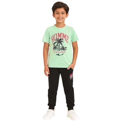 Generic - طقم بيجامة ولادي صيفي، تيشيرت أخضر فاتح مع طباعة نخيل، بنطلون أسود قطن