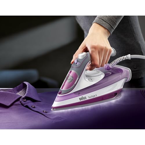 Braun - مكواة بخار منزلية تيكستايل 5 برو مزودة بقاعدة كي فري جلايد 3 دي وبخار عمودي بقدرة 2700 واط من براون، بنفسجي، SI5037VI