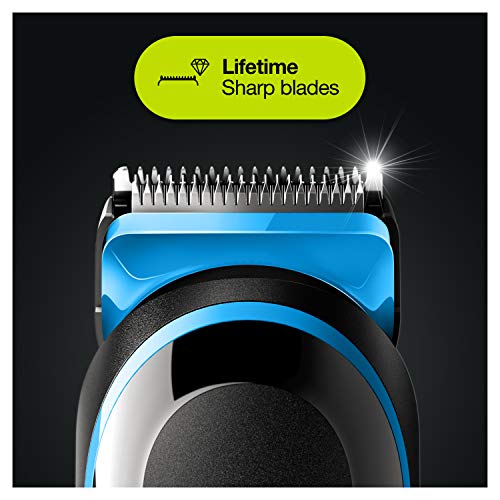 - مجموعة التشذيب 3 7 في 1 من براون، موديل MGK3245 – مجموعة التشذيب وقص الشعر وتشذيب الوجه مع شفرات حلاقة حادة تدوم طويلاً و5 ملحقات، لون أسود وأزرق، حلاقة أنيقة بدون مجهود