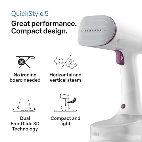 Braun - مكواة كويك ستايل 5 GS5011PU، مكواة عمودية مع لوحة مزدوجة فري جلايد ثلاثية الأبعاد، بخار عمودي سريع التسخين، بخار 22 جرام/دقيقة، سعة 150 ملليلتر، 1200 وات من براون، أبيض/أرجواني