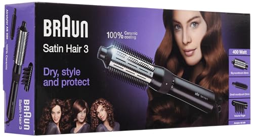 Braun - فرشاة تصفيف الشعر بالهواء الساخن AS330 من براون ساتين هير مع 3 اكسسوارات، اسطوانة مطلية بالسيراميك، طاقة 400 وات، إعدادين للحرارة، لون أسود، موديل BRAS330E