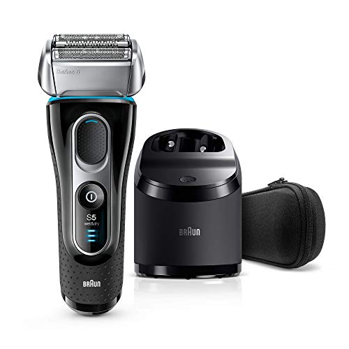 - ماكينة حلاقة كهربائية 5190cc السلسلة 5 مع نظام التنظيف والشحن من براون للرجال، تأتي بأداة تشذيب دقيقة منبثقة، ومقاومة للماء والرطوبة بلون اسود/ ازرق