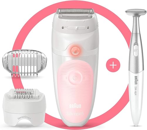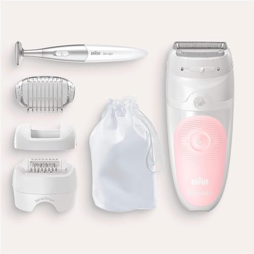 - ماكينة ازالة الشعر للاستخدام الجاف والرطب سيلك ابيل 5-820 من براون مع راس للحلاقة وغطاء للتدليك، تتضمن قطعة للبيكيني، تستخدم جافة او تحت الماء، فكرة هدية، لون ابيض وبينك